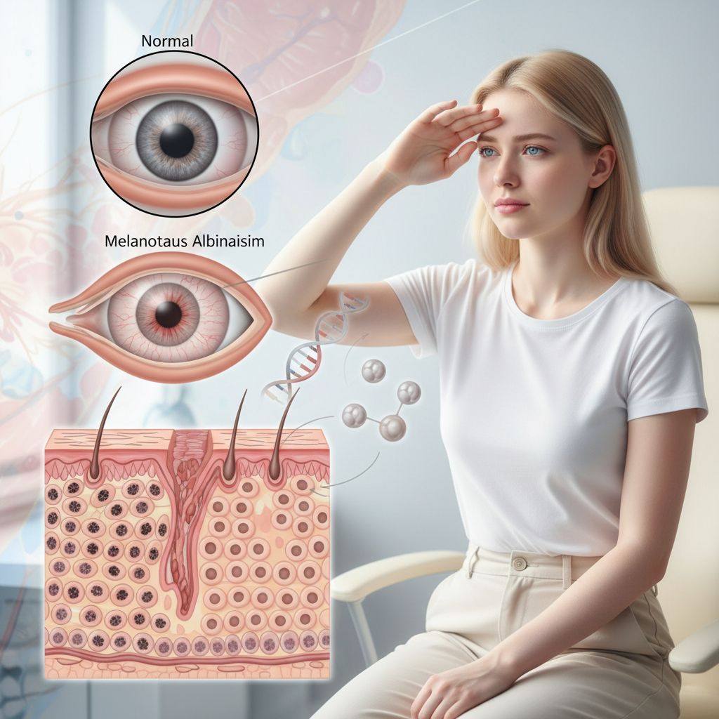 O albinismo oculocutâneo, também chamado simplesmente de albinismo, é uma condição genética que afeta a produção de melanina, resultando em pele, cabelo e olhos muito claros, além de problemas de visão significativos. A falta de melanina aumenta a vulnerabilidade a danos solares e eleva o risco de câncer de pele, exigindo cuidados especiais com a proteção solar e acompanhamento oftalmológico regular.