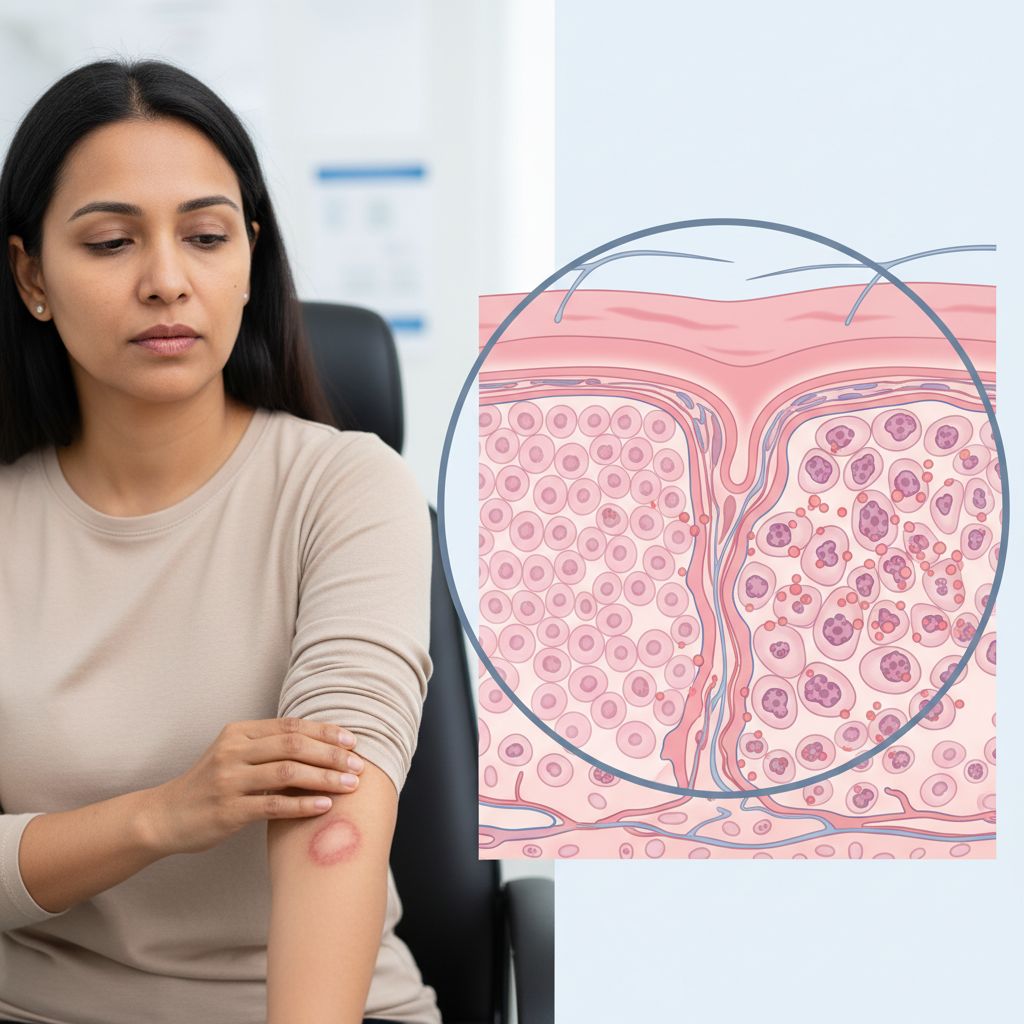 O carcinoma in situ da pele, também chamado de doença de Bowen, é um câncer de pele não invasivo que se manifesta por manchas vermelhas e descamativas na pele, geralmente assintomáticas, mas que podem coçar ou sangrar. Embora não se espalhe para outros órgãos, o carcinoma in situ precisa ser tratado para prevenir a progressão para um câncer de pele invasivo.