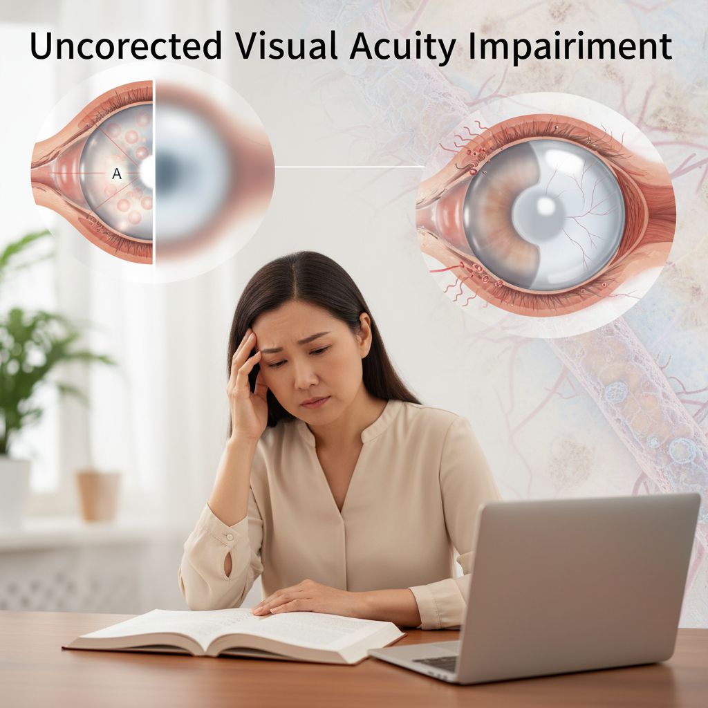 O comprometimento da acuidade visual não corrigida, como miopia, hipermetropia ou astigmatismo, dificulta a nitidez da visão, causando sintomas como visão turva e fadiga ocular, o que pode limitar a independência e aumentar o risco de acidentes. A correção visual, através de óculos ou lentes de contato, é essencial para mitigar esses impactos e melhorar a qualidade de vida.