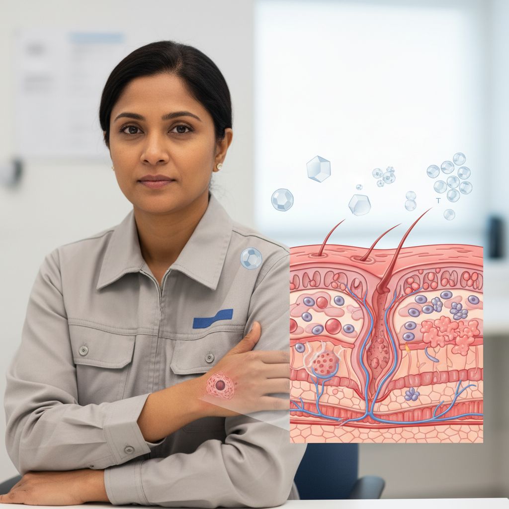 A dermatite de contato alérgica devida a biocidas industriais, óleos de corte ou desinfetantes manifesta-se com erupções cutâneas, coceira intensa e inflamação na pele após o contato com esses produtos químicos, afetando principalmente trabalhadores industriais. Essa condição pode levar a desconforto significativo, absenteísmo no trabalho e, em casos graves, à necessidade de mudança de profissão.