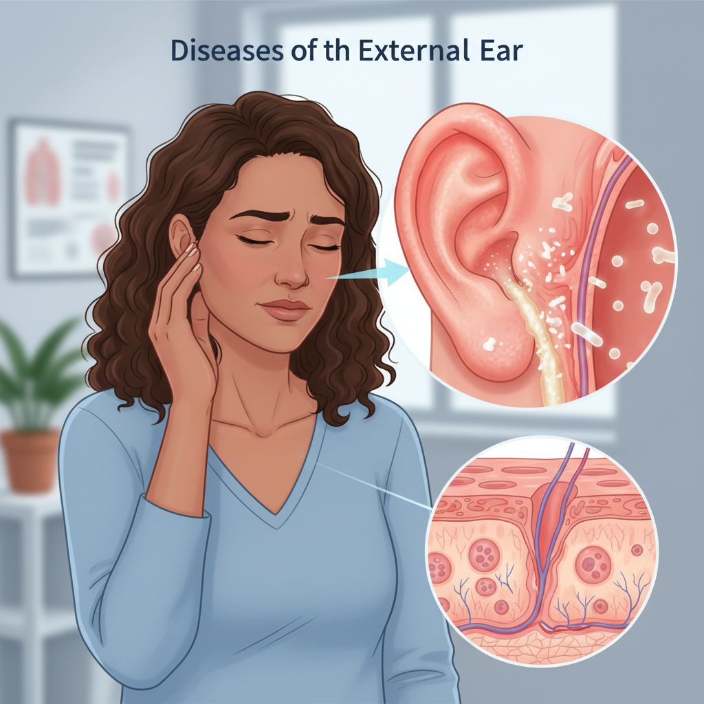 Doenças do ouvido externo, como otite externa e eczema, afetam a pele do canal auditivo, causando dor intensa, coceira e secreção. O tratamento precoce é crucial para aliviar os sintomas e prevenir complicações como infecções crônicas ou perda auditiva.
