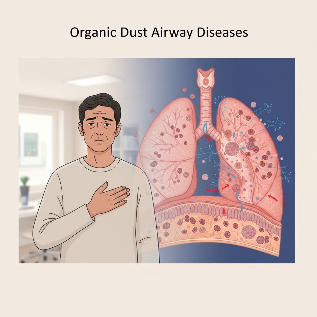 A doença de vias aéreas causada por poeiras orgânicas específicas, como a pneumonite de hipersensibilidade, ocorre quando a inalação dessas poeiras desencadeia uma resposta inflamatória nos pulmões. Os sintomas comuns incluem tosse, falta de ar, febre e fadiga, e a exposição contínua pode resultar em fibrose pulmonar e comprometimento da função respiratória.