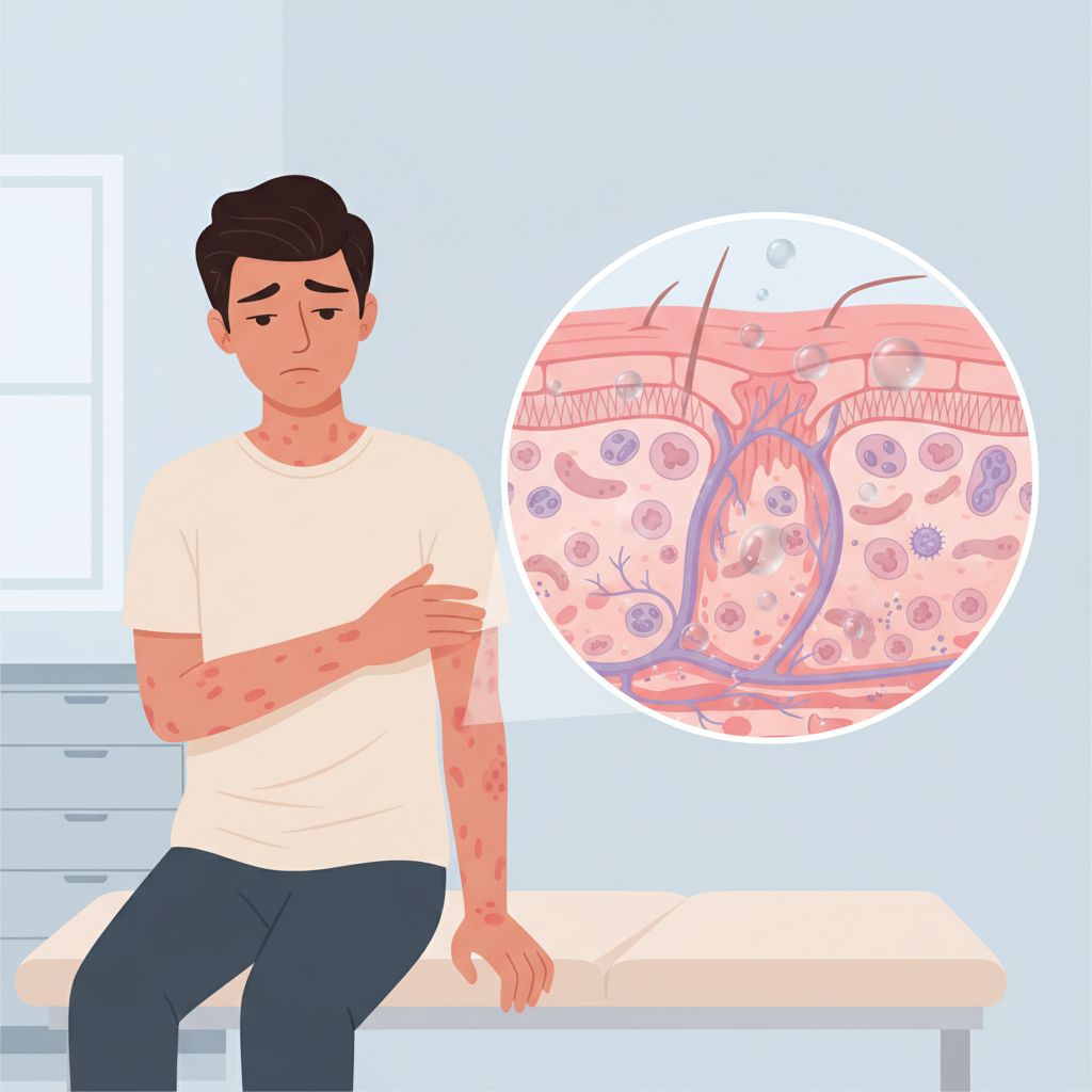 A erupção por droga de tipo não especificado, também referida como reação alérgica a medicamentos, se apresenta com sintomas como manchas vermelhas, coceira intensa e inchaço na pele, podendo evoluir para quadros mais sérios com comprometimento da saúde geral. Em situações raras, a condição pode levar a complicações graves como a síndrome de Stevens-Johnson.