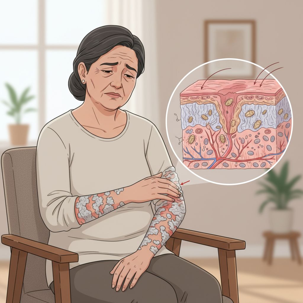 A escabiose crostosa, também conhecida como sarna norueguesa, é uma forma severa de escabiose onde milhões de ácaros se proliferam na pele, formando crostas espessas e esfareladas, especialmente nas mãos, pés, cotovelos e couro cabeludo. Essa condição causa coceira intensa, pode levar a infecções secundárias graves e apresenta alto risco de contágio, sendo mais comum em pessoas com sistema imunológico enfraquecido.