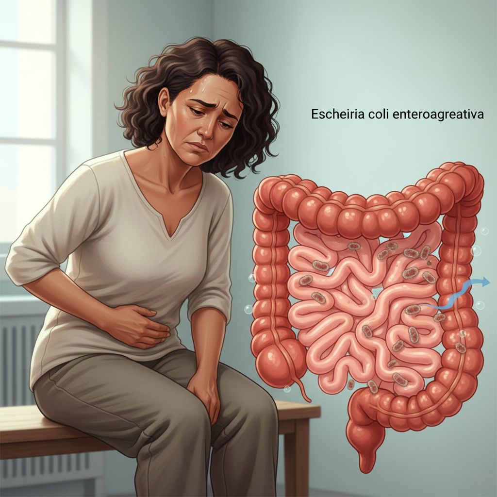 A Escherichia coli enteroagregativa (EAggEC) é uma bactéria causadora de diarreia, especialmente comum em crianças e viajantes, manifestando-se através de sintomas como diarreia persistente, cólicas abdominais e vômitos, o que pode levar à desidratação e outros problemas de saúde. Essa bactéria se adere às células do intestino, formando um biofilme que dificulta a absorção de água e nutrientes.
