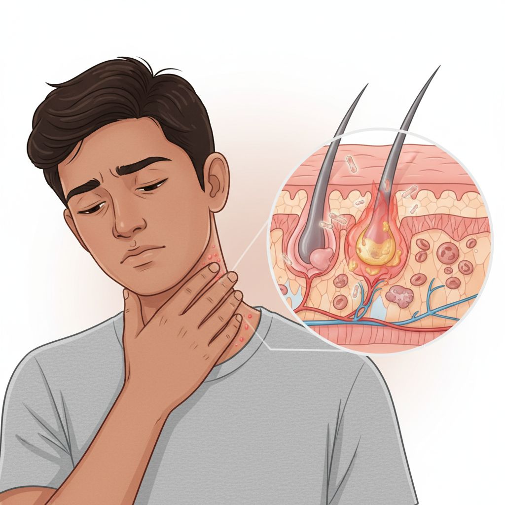A foliculite bacteriana superficial, uma inflamação dos folículos pilosos, se apresenta comumente como pequenas pústulas ou bolhas avermelhadas na pele, frequentemente acompanhadas de coceira e desconforto. A condição, geralmente causada por bactérias, pode gerar irritação e preocupação estética, impactando a qualidade de vida do indivíduo.