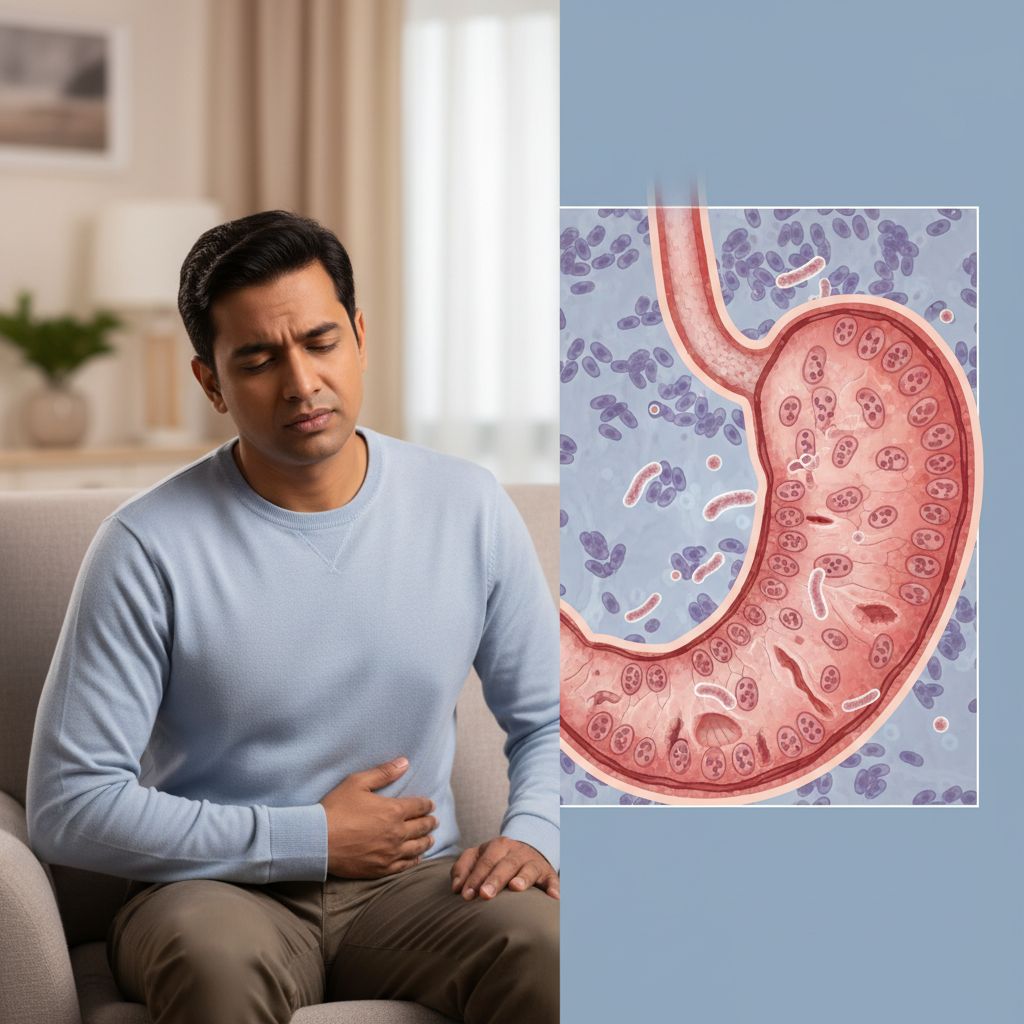 A Helicobacter pylori (H. pylori) é uma bactéria que infecta o revestimento do estômago, causando sintomas como dor abdominal, indigestão e azia, e pode levar a gastrite e úlceras. Se não tratada, a infecção por H. pylori pode aumentar o risco de câncer de estômago.