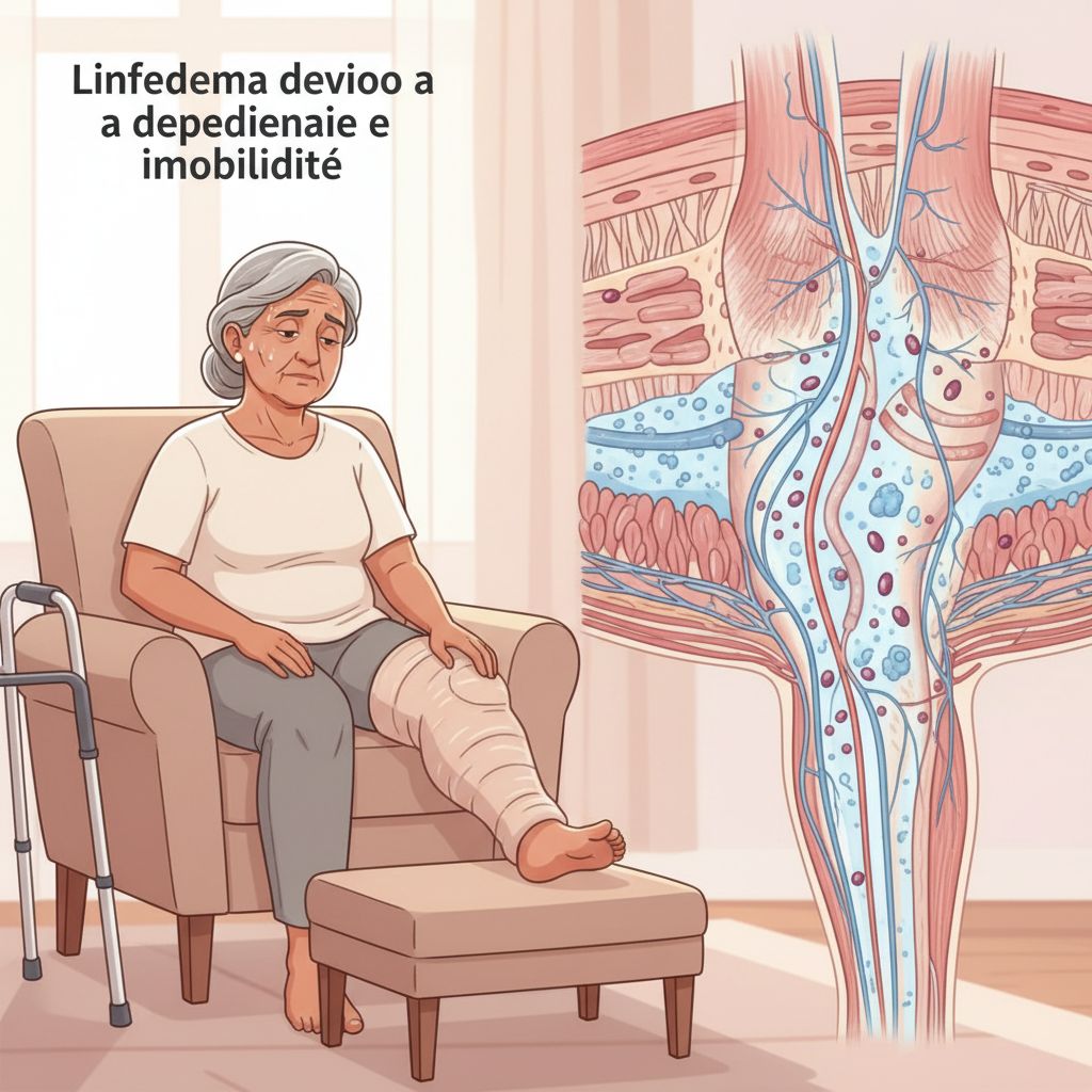 O linfedema devido à dependência e imobilidade, por vezes referido como "inchaço linfático", resulta do acúmulo de linfa nos tecidos moles, levando a sintomas como inchaço crônico, sensação de peso e maior suscetibilidade a infecções. Essa condição pode gerar um impacto considerável na saúde, limitando a capacidade funcional e elevando o risco de complicações como fibrose e celulite infecciosa.