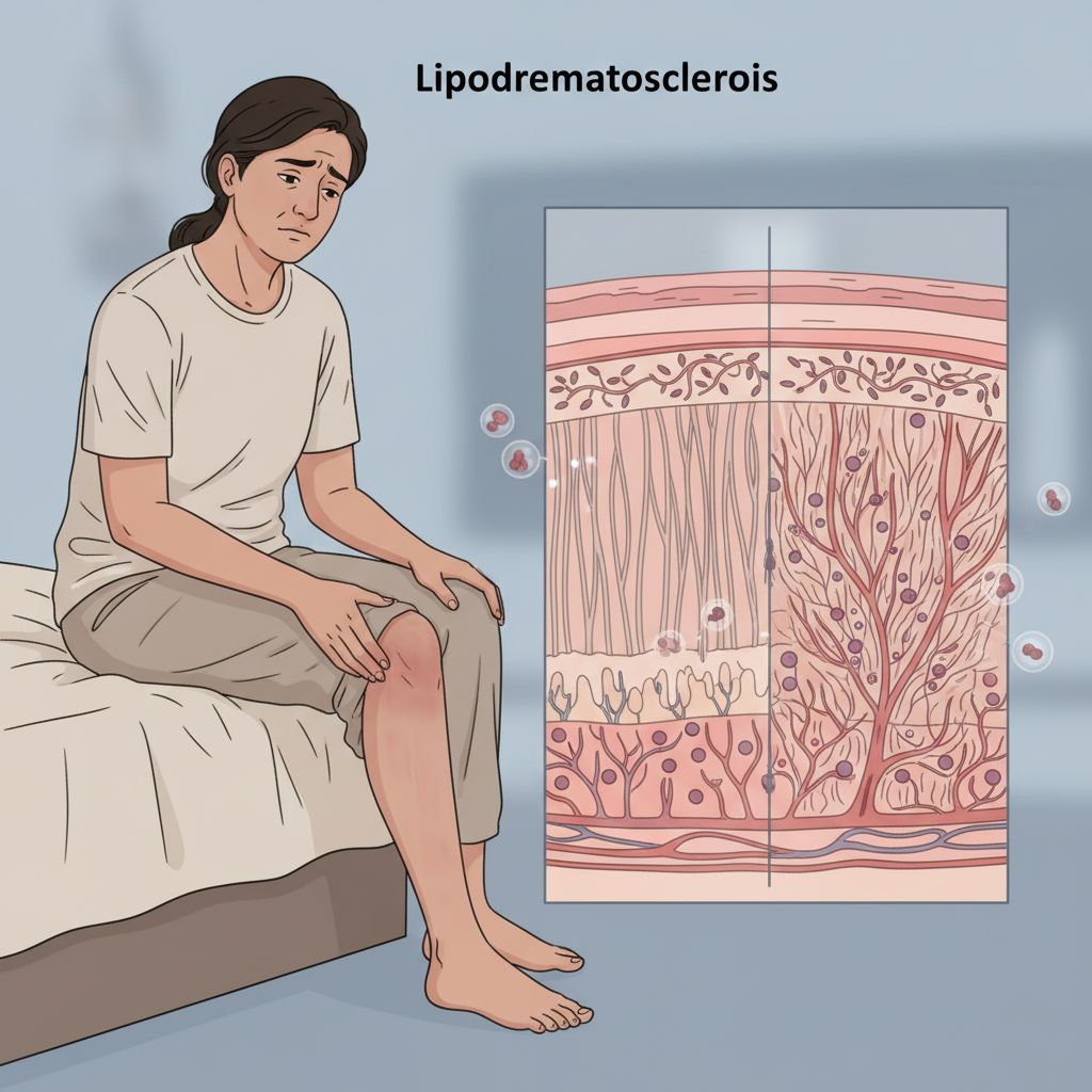 A Lipodermatosclerose é uma condição inflamatória crônica que afeta a pele e o tecido subcutâneo, comumente nas pernas, manifestando-se por endurecimento da pele, dor, inchaço e hiperpigmentação. Essa condição pode levar a complicações como úlceras e dificuldades de mobilidade, impactando significativamente a qualidade de vida do indivíduo.