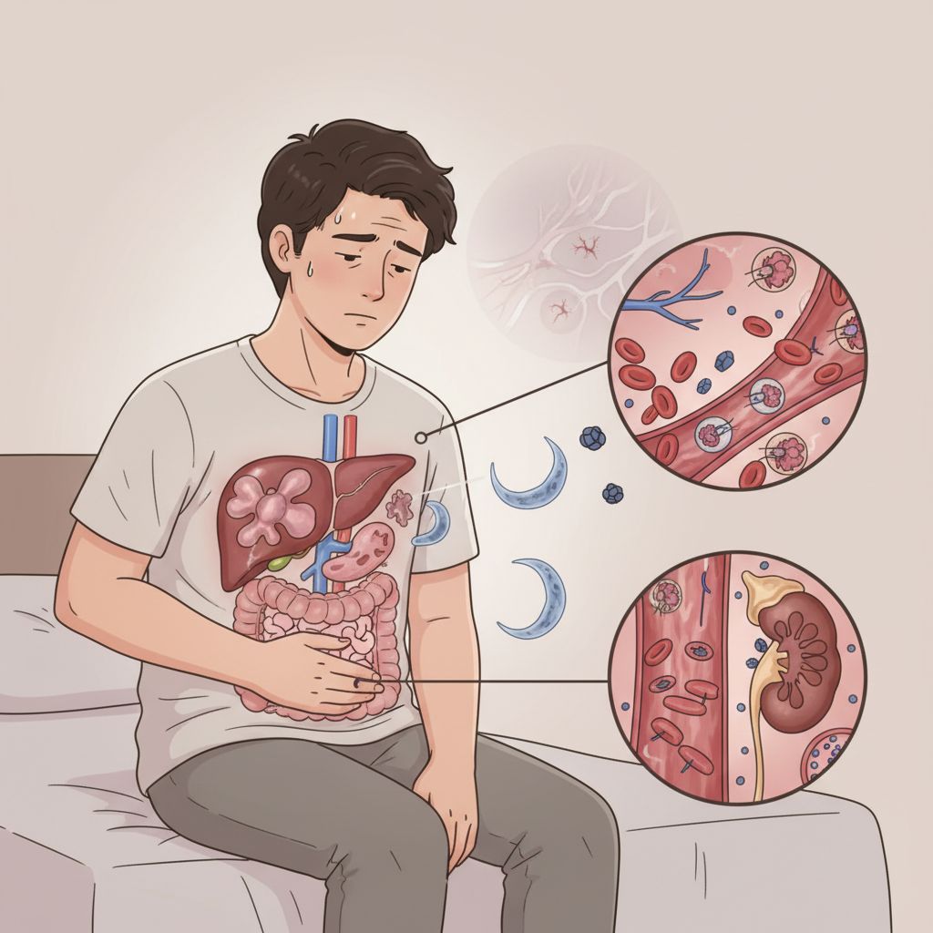 A malária causada pelo Plasmodium vivax com outras complicações, comumente chamada de maleita, apresenta sintomas como febre, tremores e suores intensos, podendo evoluir para anemia severa e disfunção de órgãos. Essa forma da doença pode causar sérios danos à saúde, incluindo complicações neurológicas e risco de morte.