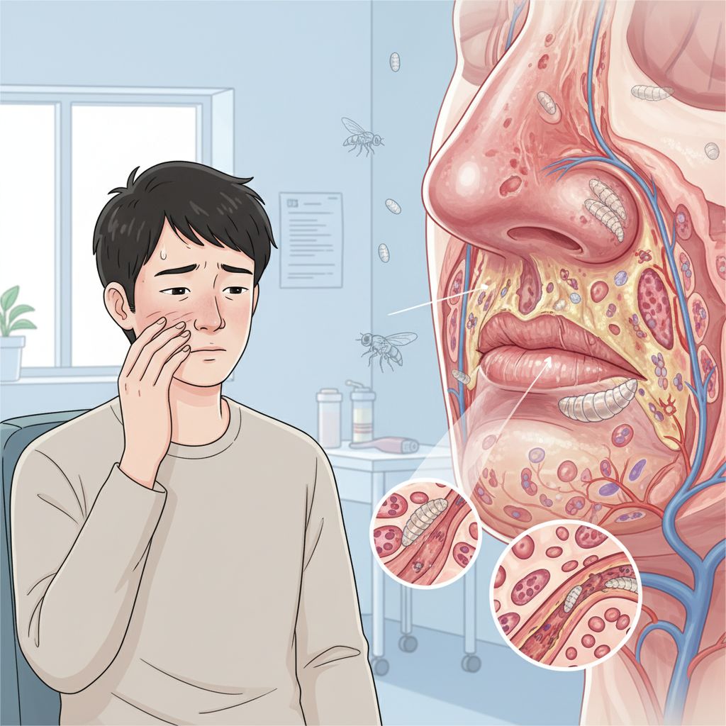 A miíase nasofaríngea é uma condição causada pela infestação de larvas de moscas em tecidos do nariz e da garganta, resultando em sintomas como dor, sangramento e secreção fétida. Se não tratada, essa condição pode levar a complicações graves e danos aos tecidos.