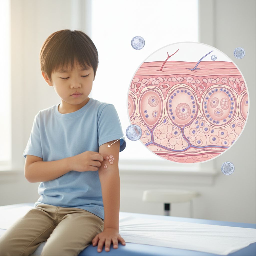 O molusco contagioso é uma infecção viral comum da pele causada por um poxvírus, resultando em pequenas pápulas ou nódulos elevados, geralmente com um umbigo central, que podem causar coceira ou irritação leve. Embora geralmente não represente um risco grave para a saúde, a infecção pode ser persistente e se espalhar para outras áreas do corpo ou para outras pessoas através do contato direto.