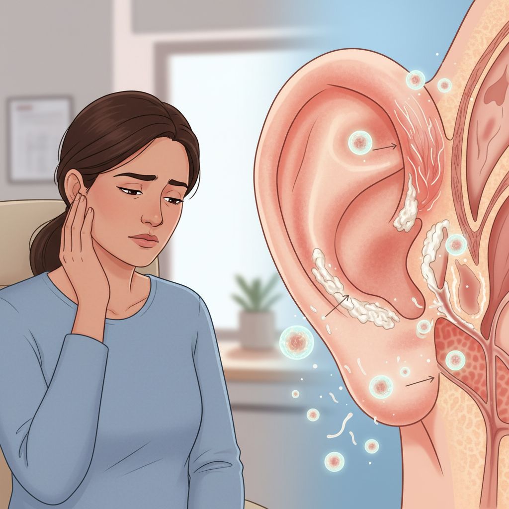 A otomicose por Candida é uma infecção fúngica do ouvido, frequentemente causada por espécies de Candida, que provoca sintomas como coceira intensa, dor, secreção e sensação de ouvido entupido, podendo levar à perda auditiva temporária se não tratada adequadamente. Essa condição pode causar desconforto significativo e afetar a capacidade de audição, impactando a comunicação e o cotidiano do indivíduo.