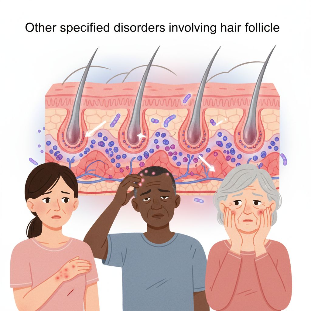 Outras afecções especificadas envolvendo o folículo piloso referem-se a um grupo diverso de condições que afetam os folículos capilares, causando sintomas como inflamação, coceira e erupções cutâneas, impactando a saúde da pele e podendo levar a desconforto estético e emocional. Essas condições, embora menos frequentes, necessitam de diagnóstico e tratamento adequados para evitar complicações.