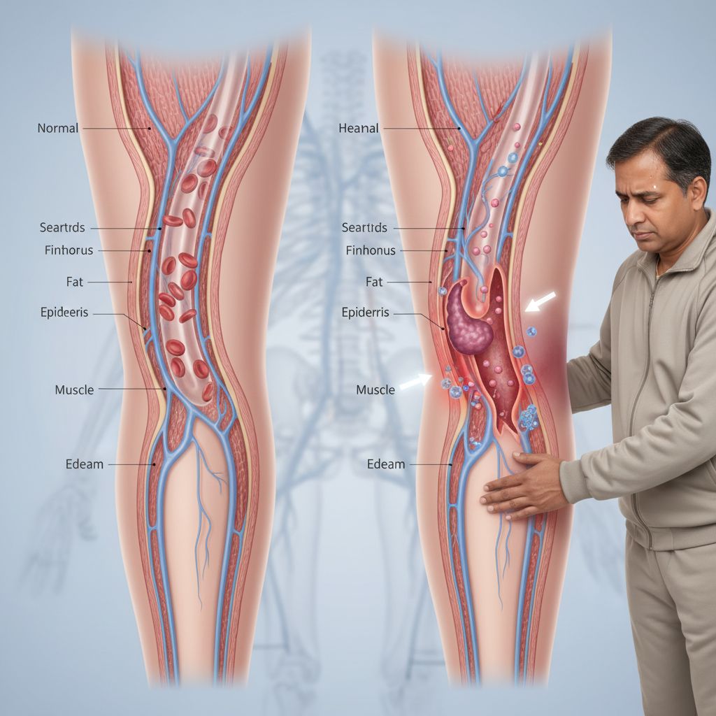 O traumatismo da veia grande safena ao nível da perna, que é a principal veia superficial da perna, pode resultar de traumas diretos ou procedimentos médicos, causando dor, inchaço e hematomas. A longo prazo, essa lesão pode levar a complicações como trombose venosa profunda ou insuficiência venosa crônica.