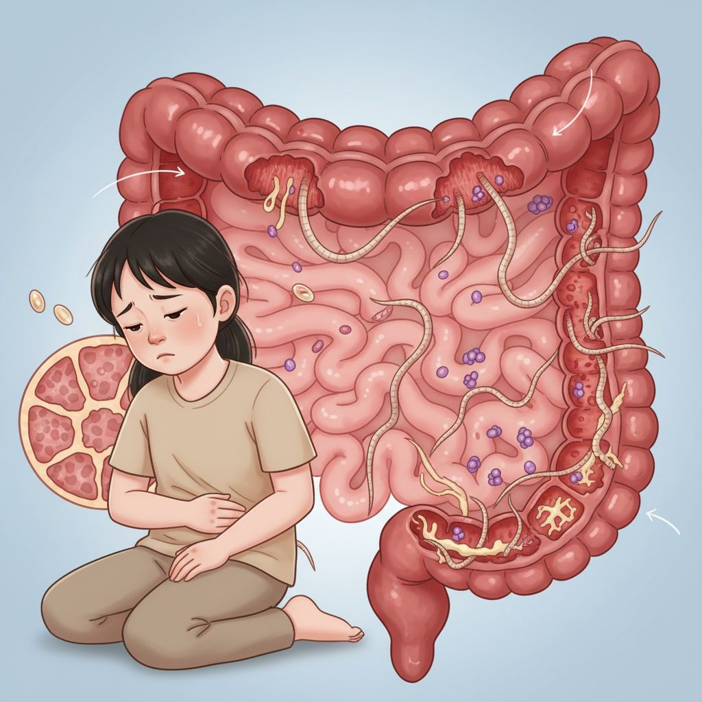A infecção por Trichuris trichiura, popularmente conhecido como tricocéfalo, causa a tricuríase, uma verminose intestinal que pode provocar dor abdominal, diarreia e anemia, afetando principalmente crianças em áreas com saneamento precário. Em casos graves, a tricuríase pode levar ao retardo no crescimento e desenvolvimento.