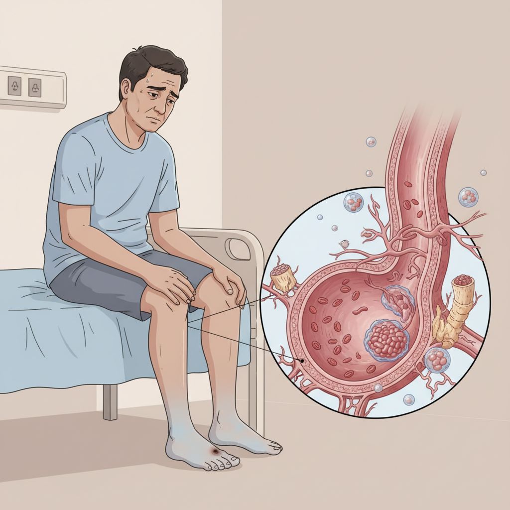 A Tromboangiite obliterante, ou doença de Buerger, é uma enfermidade inflamatória rara que afeta artérias e veias de pequeno e médio calibre, especialmente nos braços e pernas, levando à formação de trombos e obstrução dos vasos. Fumantes são os mais afetados, sofrendo com dor intensa, úlceras e risco de amputação devido à falta de irrigação sanguínea nos membros.