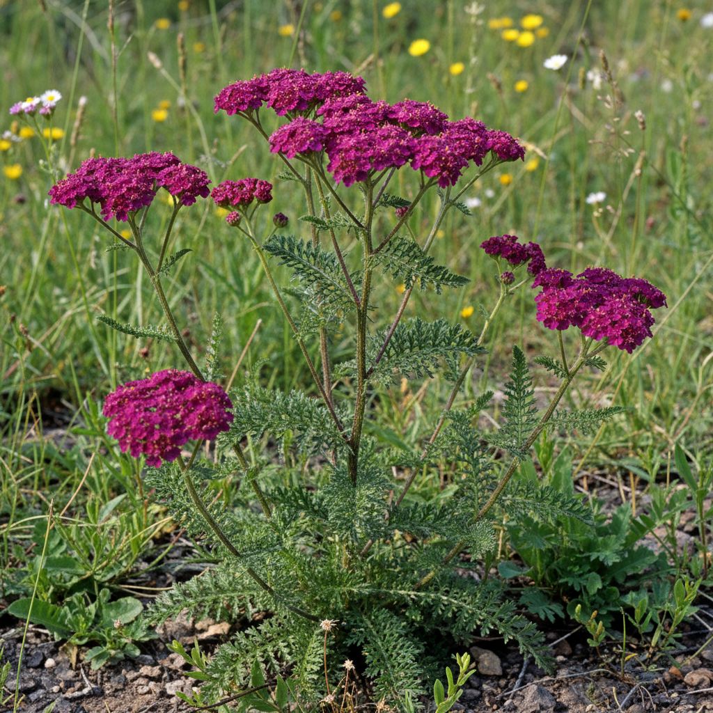 Achillea tanacetifolia var. purpurea, também conhecida como milefólio-púrpura, possui propriedades medicinais comprovadas, sendo utilizada tradicionalmente para tratar problemas gastrointestinais, como inflamações e dispepsias, além de possuir ação anti-inflamatória e cicatrizante, sendo eficaz em feridas e queimaduras; estudos científicos demonstram sua eficácia em aliviar cólicas menstruais e em casos de inflamações em geral, sendo rica em compostos bioativos como flavonoides, taninos e óleos essenciais que contribuem para suas propriedades terapêuticas, a tornando uma aliada natural para o bem-estar.