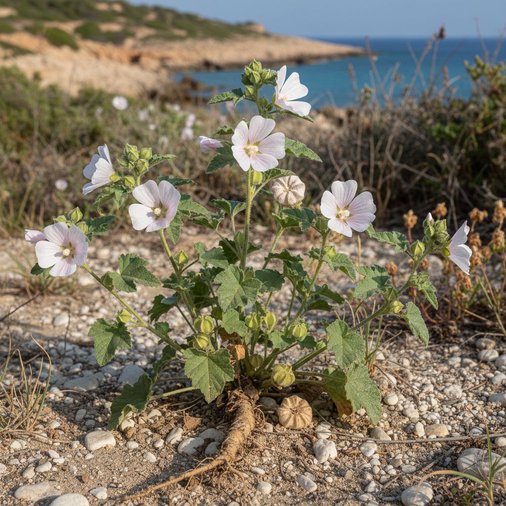 Althaea cretica, também conhecida como marshmallow-de-creta, possui propriedades medicinais reconhecidas, principalmente devido à sua rica composição em polissacarídeos, mucilagens e compostos fenólicos que atuam como anti-inflamatórios, protegendo as mucosas e aliviando irritações em problemas respiratórios e digestivos, demonstrando ser um excelente aliado na saúde humana. Seu uso tradicional se estende a outras condições, graças aos seus benefícios anti-inflamatórios, expectorantes e emolientes, mostrando uma grande versatilidade terapêutica.