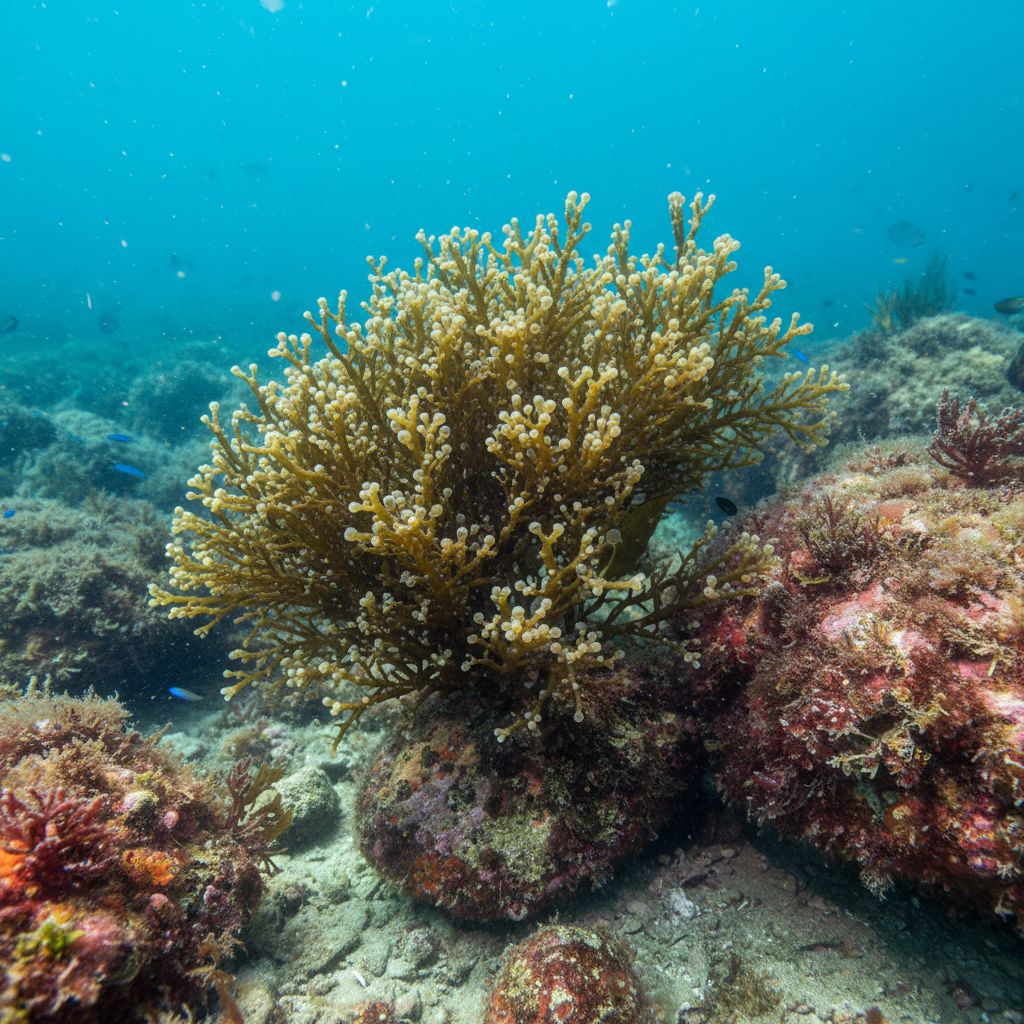 A Cystophora uvifera, uma alga marinha, apresenta potenciais benefícios para a saúde, atuando como um poderoso antioxidante e fortalecendo o sistema imunológico devido à sua rica composição em nutrientes essenciais e compostos bioativos, contribuindo para uma vida mais saudável e plena; além disso, estudos preliminares sugerem outras propriedades benéficas, como auxílio na manutenção da saúde cardiovascular e na regulação dos níveis de colesterol.